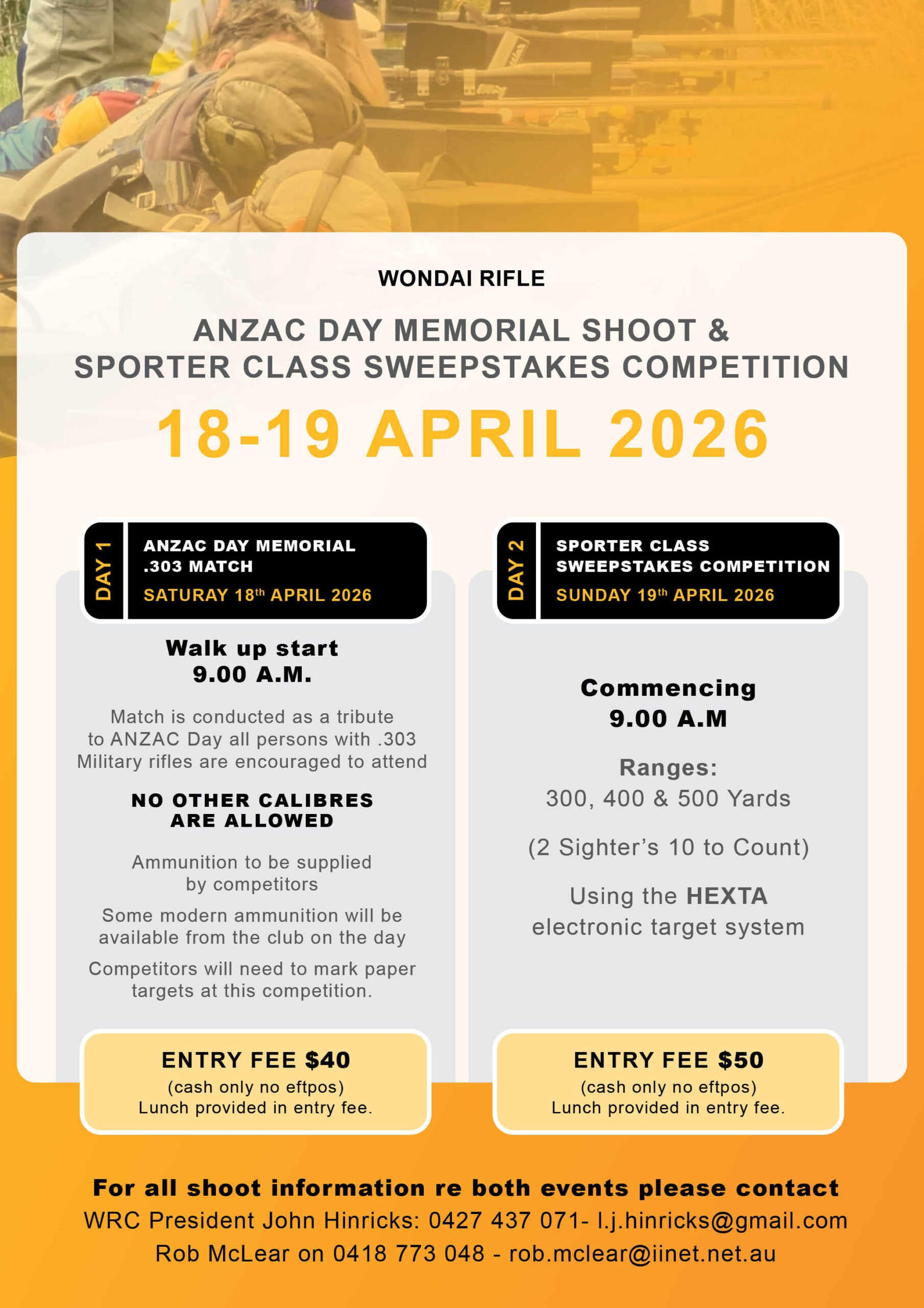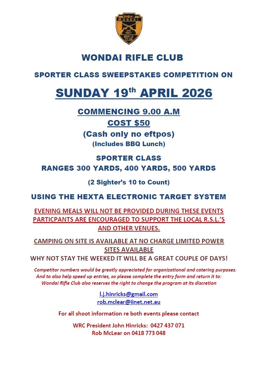 Wondai Rifle Club contact persons for these events are: Wondai President – John Hinricks 0427 437 071 Rob McLear - 0418 773 048 John - l.j.hinricks@gmail.com Rob - rob.mclear@iinet.net.au