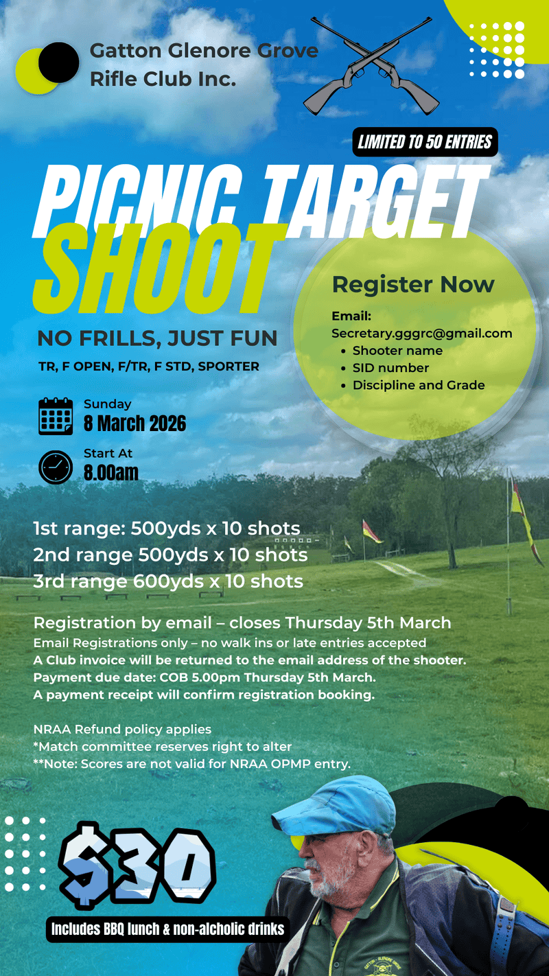 A Club invoice will be returned to the email address of the shooter. Payment due date: COB 5.00PM Thursday 5th March. A payment receipt will confirm registration booking. Booking ahead takes the guesswork out of catering for the event.